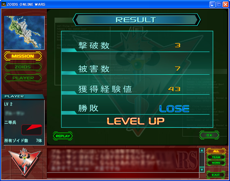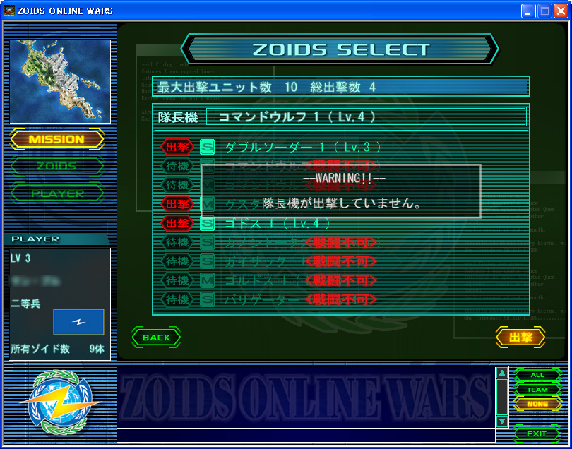 | 全滅で負けても,敵ZOIDSを倒せればレベルアップはできる。が,レベル差があるとなかなかそれも難しい | 隊長機も撃破されると出撃できなくなる。一度ZOWを閉じて,ZUのサイトで隊長機を変更する必要がある |