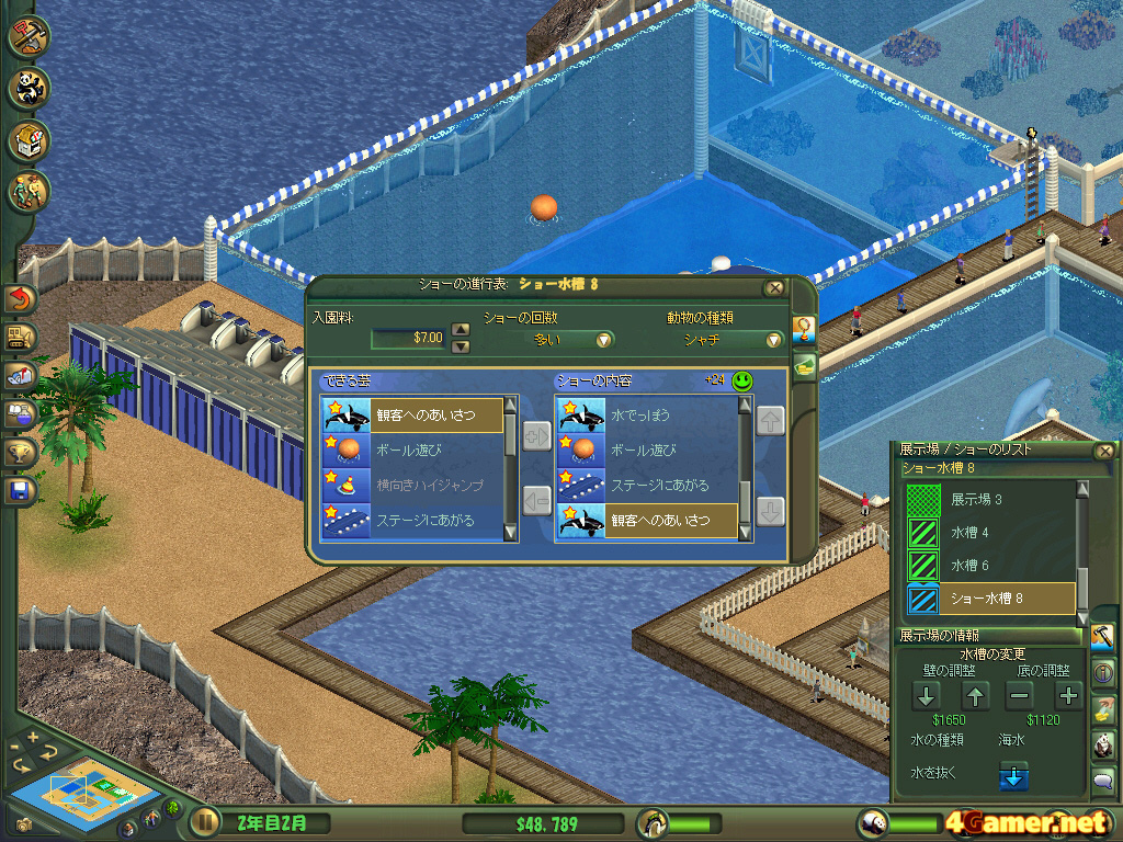 やはり一番楽しいのは,シャチ,イルカ,ラッコなどの動物ショウを演出できるところだ。動物達にどんな芸を披露させるのかショウプログラムを組むことができ,例えばシャチでショウを演出するなら,観客へのあいさつ→後ろ向きテールウォーク→水鉄砲→観客へのあいさつ→ジャンプ→ステージに上がる→観客へのあいさつといった感じだ。来園者が面白いと思えるショウプログラムを考えるのは当然だが,プレイヤーも眺めて楽しめるので,まずは自由に組んでみよう。