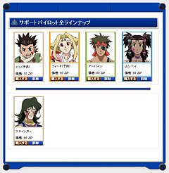 ZOWには,テレビアニメシリーズ「ゾイド -ZOIDS-」に登場した主要なキャラクターが「サポートパイロット」として登場する。ZiPを使って3日間の期間限定で雇用するというシステムで,搭乗させるとZOIDSの性能が高くなる。たとえZOIDSのレベルが高くなっても,一般の兵士を搭乗させていると,そのZOIDSの本領は発揮できないので,少しでも倒されにくくするためには,サポートパイロットの雇用をオススメしたい。