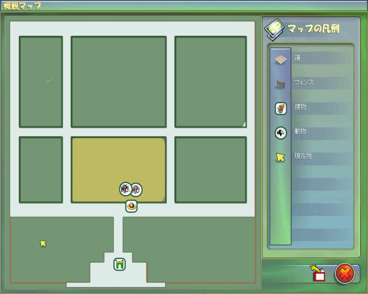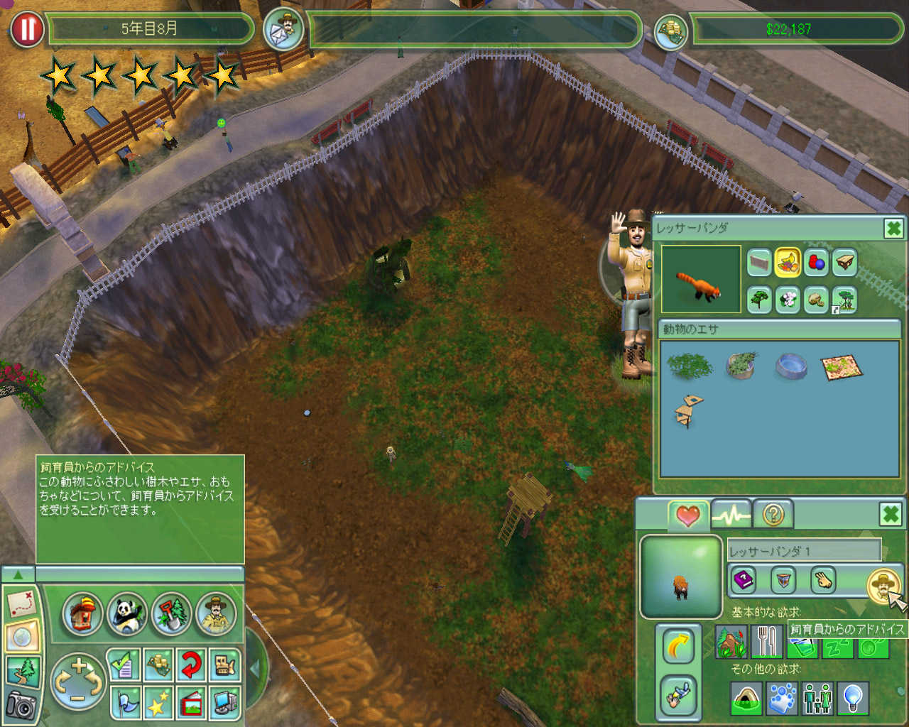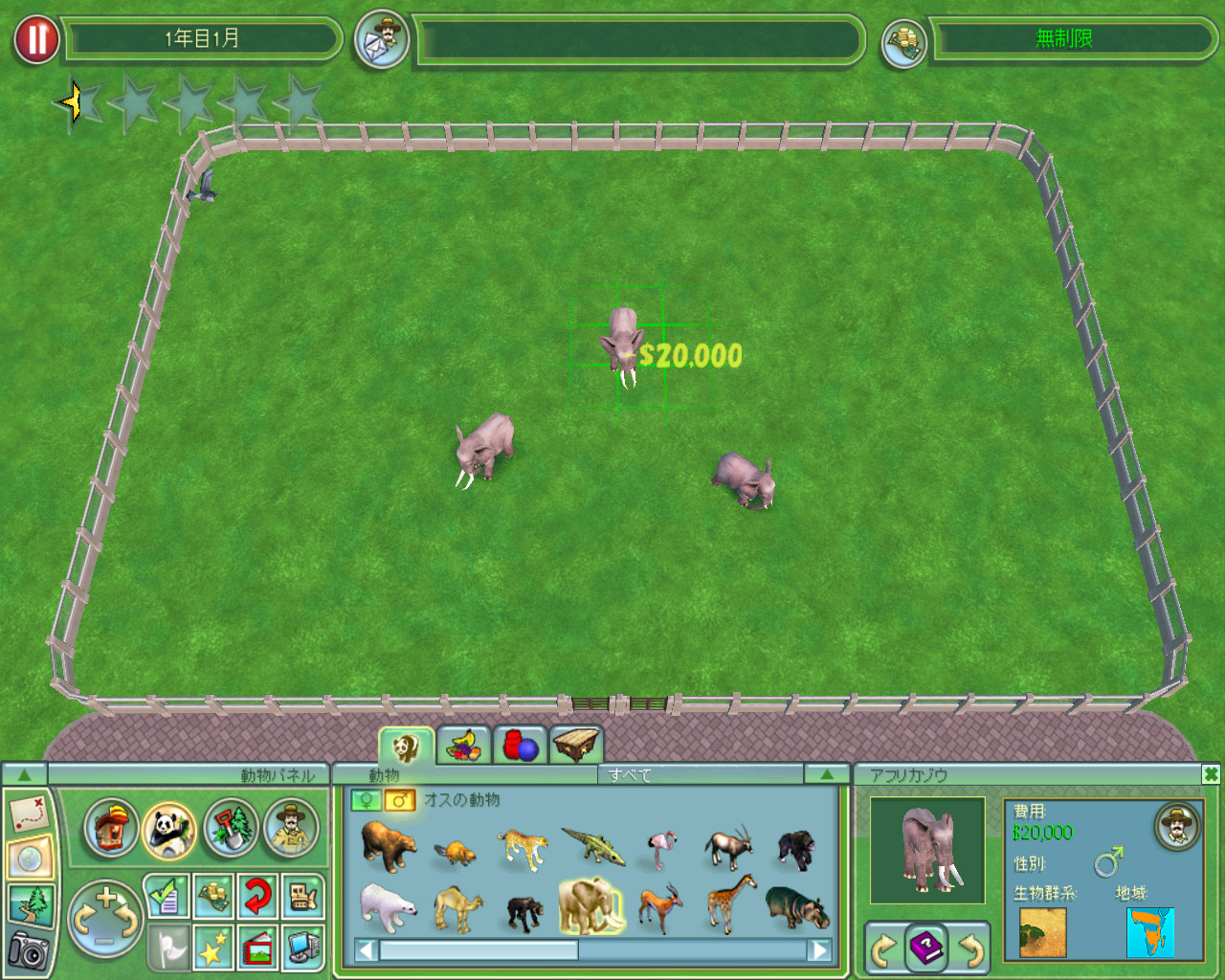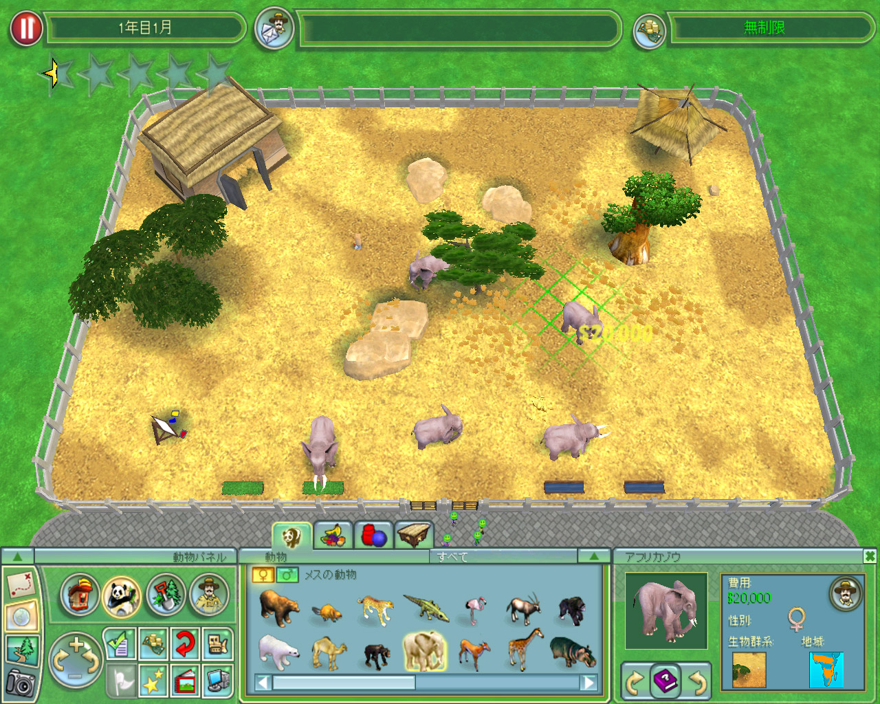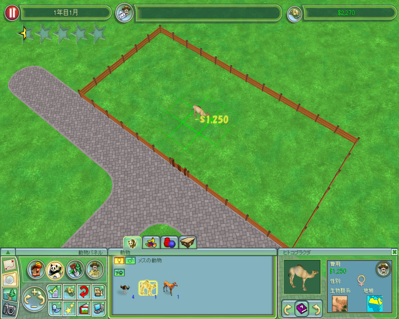 | 動物を購入する場合,まず飼育スペースを柵で囲って確保する。そのあと目的の動物を施設内に配置すればよい。これらの操作はすべて「上からの視点」で行う。あらゆる操作が感覚的にすぐ理解できるのはありがたい |