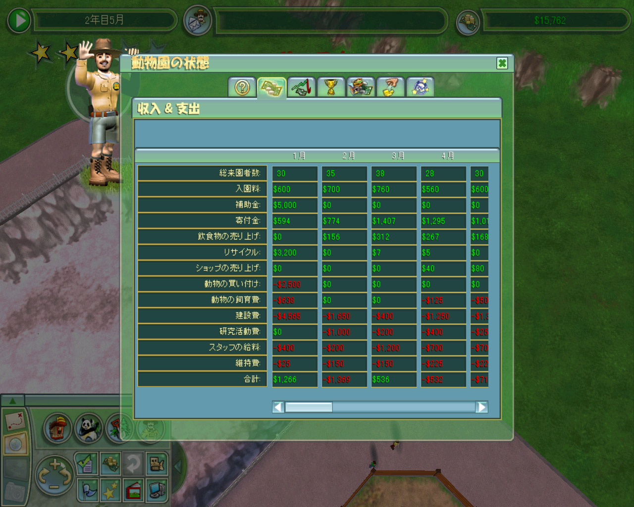| 「動物園の状態」を見ると園のさまざまな情報が分かる。とくに「収入&支出」には園の経営に関わる項目が集約されているので,ここを見ると足りない部分やムダな部分が把握できて経営方針を決めやすい |