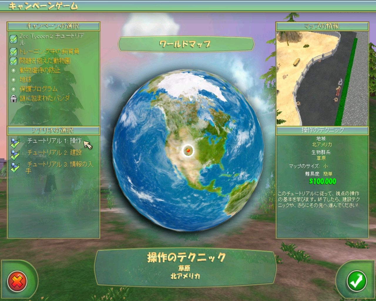 それではシステムの紹介に入ろう。ズータイクーン2でゲームを始める場合,まず「キャンペーンゲーム」と「チャレンジゲーム」,「フリーゲーム」の3種類からゲームスタイルが選べる。キャンペーンゲームはテーマに沿ったシナリオが楽しめるモードで,ゲームのチュートリアルも兼ねている。「ズータイクーン2チュートリアル」から「動物虐待の防止」くらいまでをプレイすれば,経営の基本的なノウハウは理解できるはずだ。「チャレンジゲーム」は41種類用意された動物園マップから好きなモノを選び,自分でスタート資金を選んで(最低資金は$5,000)動物園作りにチャレンジするモードである。チャレンジゲームでは最初から選べる動物の種類や設備などに制限があり,園の評判が上がるごとに少しずつ選択の幅が増えていくシステムになっているが,逆にそれらの制限が一切なく,いきなり自分の好きなように園を作ることができるのがフリーゲームだ。