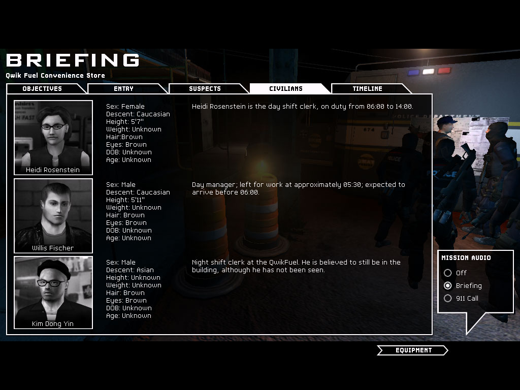 (C) 2005 Sierra Entertainment, Inc. All rights reserved. Sierra, the Sierralogo, SWAT and the SWAT logo are trademarks or registered trademarks ofSierra Entertainment, Inc., in the U.S. and/or other countries. VivendiUniversal Games and the Vivendi Universal Games logo are trademarks ofVivendi Universal Games, Inc. Developed exclusively by Irrational Games.Developer Modifications Copyright (C) 2005 Irrational Games. IrrationalGames is a trademark of Irrational Studios, LLC. Benelli product images,product names, trademarks and logos used with permission from Benelli USA,Inc. http://www.benelliusa.com. COLT, COLT (STYLIZED "C"), COLT M16,COLT M4, COLT M203, COLT 1991A1, COLT 1911, COLT 1911A1, and AR-15 (incombination and/or alone) are registered and/or common law trademarks ofNew Colt Holding Corp. or Colt's Mfg. Co., Inc. These trademarks and anytrade dress associated with these weapons are used with permission of itsowners. All rights reserved. Havok.com(TM); (C) Copyright 1999-2005Havok.com Inc. (and its Licensors). All rights reserved. See www.havok.comfor details. GameSpy and the "Powered by GameSpy" design are trademarks ofGameSpy Industries, Inc. All rights reserved. Windows is either aregistered trademark or trademark of Microsoft Corporation in the U.S.and/or other countries and is used under license from Microsoft.Pentium is a registered trademark of Intel Corporation. All othertrademarks are property of their respective owners.
