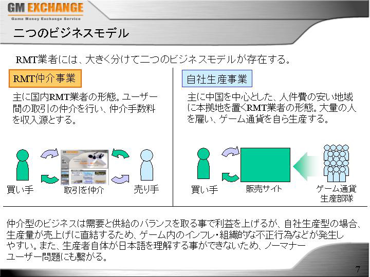 ジーエムエクスチェンジおよびRMT倫理協会の見解は,「仲介型のモデルであれば,ルールをしっかり整えていくことによって問題を解決し,RMTという市場を健全にする方法を模索できるのではないか」というものです。自社生産型の場合,どうしても効率を求めてしまいますので,周辺にいろいろネガティブな問題を抱えてしまう。