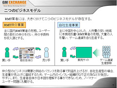 ジーエムエクスチェンジが主張する,RMT業者の二つのビジネスモデル。ただし,生産型業者が仲介型業者に売るという展開の可能性は排除できない