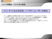 | ジーエムエクスチェンジの記者会見資料より。RMTそのものというよりも,RMTに付随して起こる問題である詐欺やBot,チートの横行を主たる話題とした部分 |