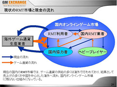こうしたレイヤーに分かれていることについて,メーカー側でもきちんと論議がなされていない。実際,RMT調査委員会があって,政府機関に近いところから検討会が提案され,9回を数えている。そこで私の考えなのですが,ジーエムエクスチェンジさんのような業者を登録制にして,売買に掛かる税金を企業が代わって納めればよい,と思うのです。これで,課税の問題はクリアになります。