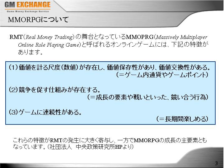 MMORPG市場の成長要因が,まさにRMTの発生に寄与しているという,社団法人 中央政策研究所の見解。ジーエムエクスチェンジの会見資料より
