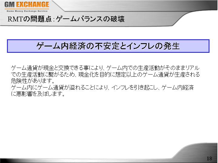 RMTがなぜいけないかについては,今まで挙がったようなさまざまな問題が絡み合っているだけでなく,ゲームのコミュニティを維持するのに邪魔な部分が非常に多い。あっちゃいけないものだから禁止しているんだよね。