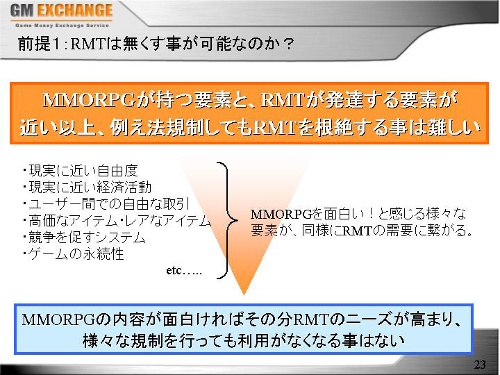 RMTは根絶できるかという論題に対する,ジーエムエクスチェンジの見解。MMORPG自体の構造や,実効的な取り締まり手段の点で,根絶は難しいという主張だ