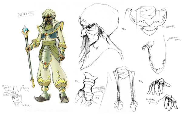 | ・ルワンとゴールドドラゴン 「呪われたオアシス」のボスは,砂漠王ルワンとゴールドドラゴン。左がオリジナル版,中央・右が現在開発中のソーサリアンオンライン版の原画だ。原作の雰囲気を残しつつ,3Dグラフィックス向けに新たにデザインし直されている。動いている画面をはやく見たいものだ |