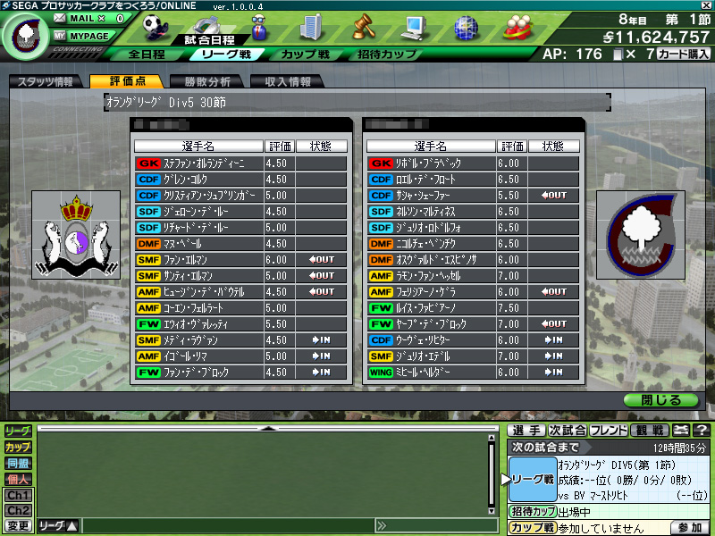 点差や両チームの統制値などが関わってきます。統制値が低いチームで高いチーム相手にいい試合ができれば,評価は良くなりますので,計画的に成長させた低ランク選手が揃う,いわゆる“玄人クラブ”の存在意義も出ます。