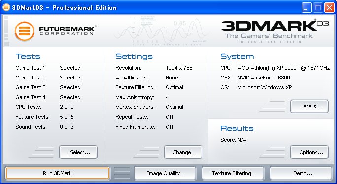 このようにビデオチップやドライバなどで実行される内容が変わってしまうとすると,製品ごとの比較などは意味を持たない。ここではシェーダについて書いたが,テクスチャフィルタリングについても自動調整されてしまうので,場合によっては処理内容がかなり違ってくる。まあ,3DMarkでの数値の高い製品がMaxFXをよく動かすものであるのは確かなのだろう。処理系としては,こういった自動調整もあってかCPU空き時間もGPU空き時間もきわめて低く抑え込まれており,ゲームエンジンとしてはとても優秀だといえる。 なお,現時点でのデフォルト3Dmarkの世界最高記録は17955となっている。