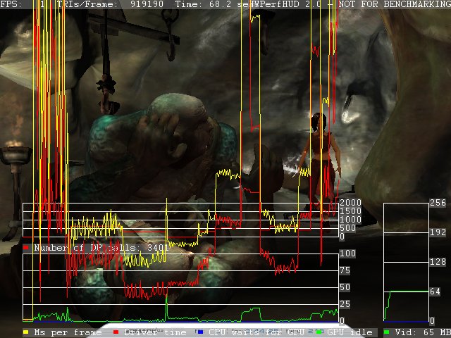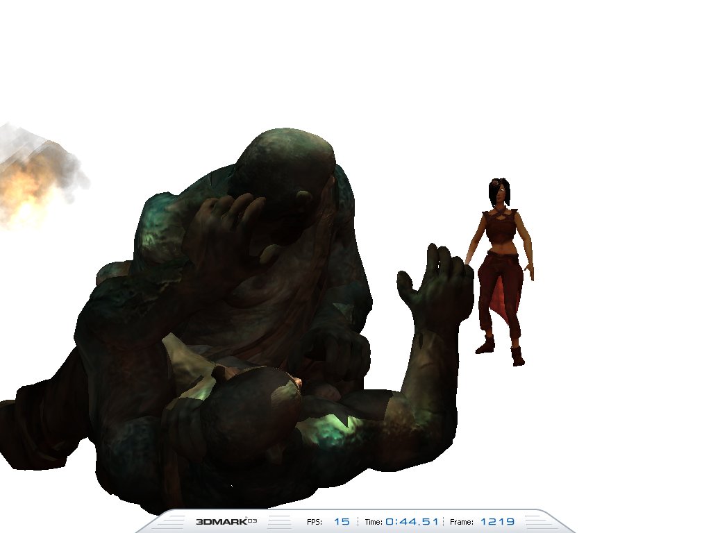・Troll's Lair 髪の毛以外の人体とトロル,背景の大部分にShader1.xが使われている。Shader2.xは使用されていない。ビデオカードによってはトロルが出てきた途端に重くなるものもある(というか,最新の製品以外は重くなる)。トロル出現時のポリゴン数は40万程度,それ以外は20万程度だから一気に倍の負荷がかかるのだ。Shader2.xは使われていないが,それなりに複雑なシェーディングもされている模様。シェーダの基本性能が問われる場面だろう。 ビデオメモリの使用量は92MBで,ビデオRAMが余っていてもAGP経由で2MBを必ず使用するようだ。CPUで書き換えているテクスチャがある模様(炎あたり?)。当然ながら,ビデオメモリが64MB級のビデオカードだとAGP経由でのテクスチャアクセスが増えて,かなりの性能低下が考えられる。