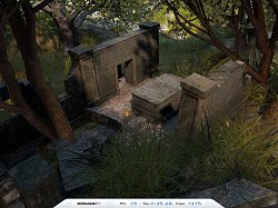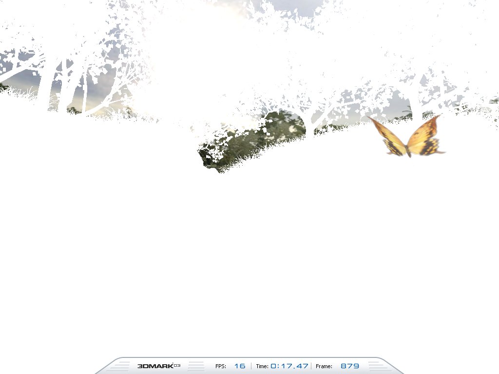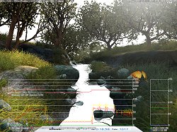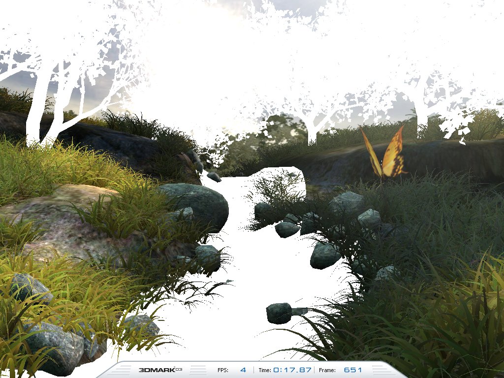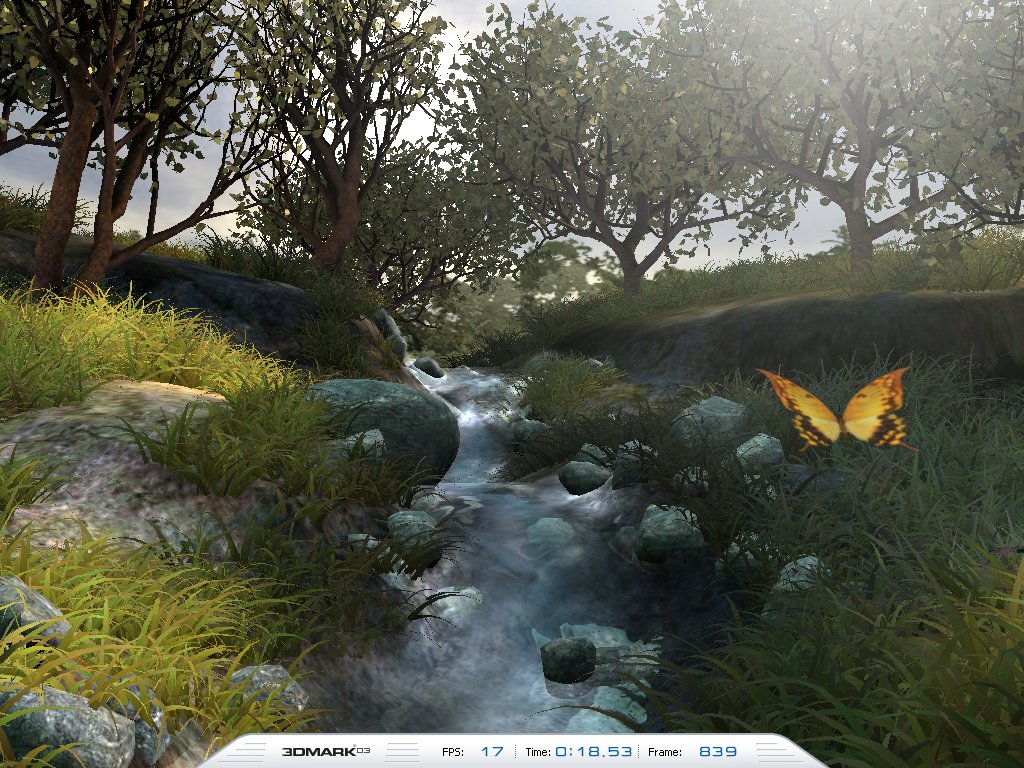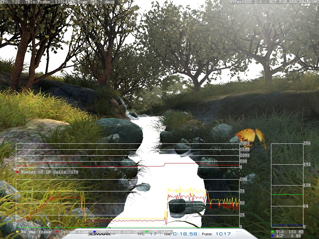 ・Mother Nature 空と水面にShader2.xの表現。ほかはShader1.xの部分がほとんどだ。再遠部の背景になる空などは固定機能で処理されることが多いのだが,ここでは手の込んだ処理がされているらしい(ほとんど画面には出てこないのだが)。ジオメトリも多く,全面的に重いシーンの連続となっている。木や草の多いシーンでは使用ポリゴン数が最大180万くらいまで跳ね上がる。ビデオメモリの使用量は意外と少なめ(?)で103MB程度。AGP経由で7MB使っているが,CPUによる水面の波紋生成などをノーマルマップ経由で処理しているのではないかと思われる。