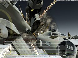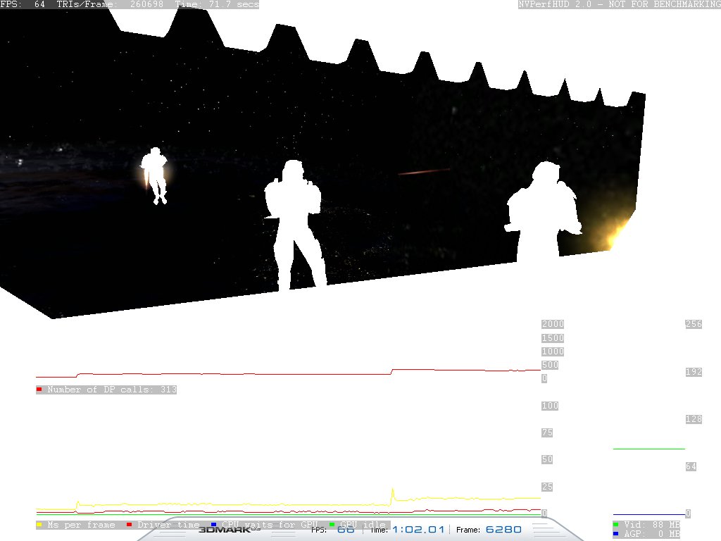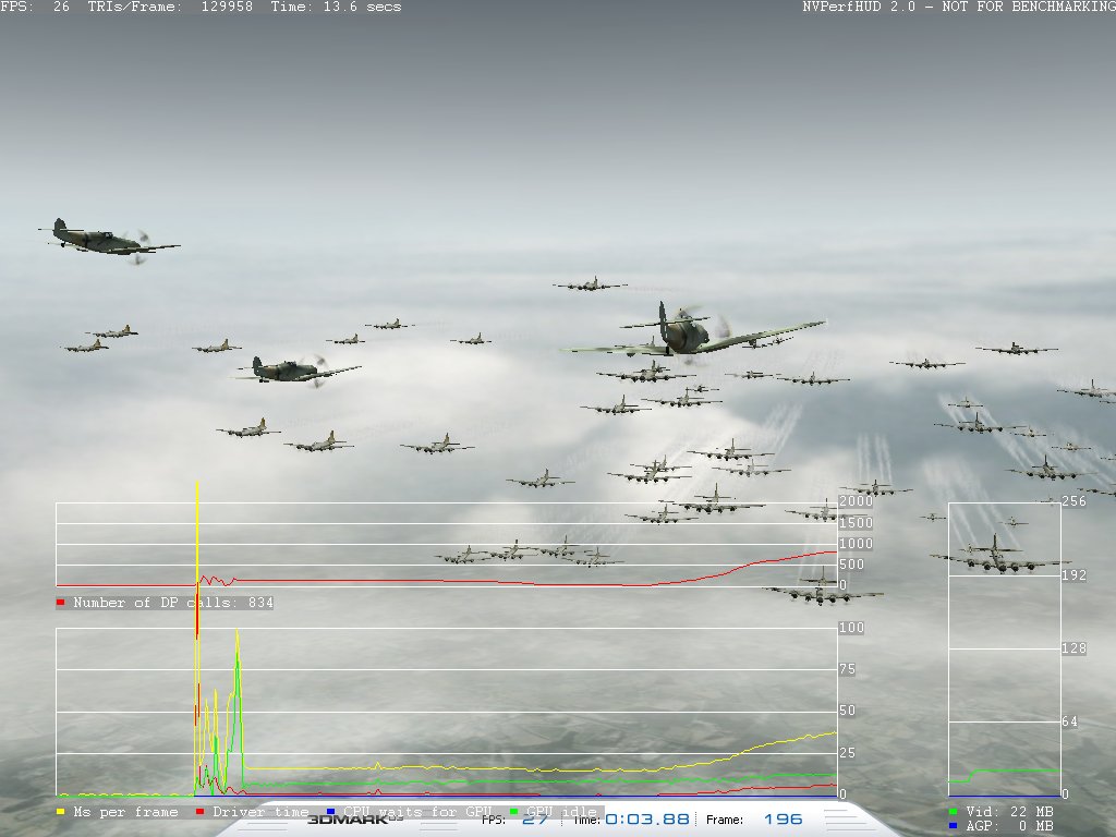 Resolution 1024×768 Pixel Processing None Texture Filtering Optimal Max Anisotropy 4 VertexShader Optimal Repeat Test Off Fixed Framerate Off ここで「Optimal」となっている部分がクセモノで,要するにMaxFXがビデオカードを見て適切な処理を行うということになる。ゲームエンジンとしては非常に優秀な処理なのだが,製品ごとに処理内容が違ってしまうと同列の比較とはいえなくなってしまう。ベンチマークとしてはいかがなものかと思わせる項目だ。 とりあえずベンチマークを実行すると,たくさんのテストを連続して行うが,最終的な数値としてカウントされるのは最初の四つのゲームベンチの部分だけだ。以下は,GeForce 6800 GTを使用した場合のゲームテスト部分の詳細である。 ・Wings of Fury プログラマブルシェーダは使われていない。比較的単純なレンダリングでNVperfHUDの上側のグラフ,DrawPrimitiveコールの数がきわめて低く抑えられている。序盤に少しだけ重いシーンが出てくるが,表示されている飛行機数が50機程度なのでいたしかたなし。ポリゴン数でいうと数千から多くても5,6万ポリゴンのシーンのデモだが,ここだけは10万ポリゴンを超えている。ビデオメモリの使用量は25MBなので,32MBのVRAMでもこのクオリティで大丈夫。