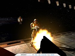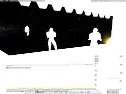 ・Battle of Proxycon ダイナミックライティングとシャドウイングが全面に使われているテスト。基地内などShader1.xによる描画が多く,Shader2.xは使用されていない。だいたい15万〜30万ポリゴンのシーンが続いている。いろいろ複雑な画面に見えるが,DrawPrimitiveコールはきわめて低い。ビデオメモリの使用量は89MBと多めなので,64MB搭載のビデオカードでもAGP経由のテクスチャアクセスが発生することになる。