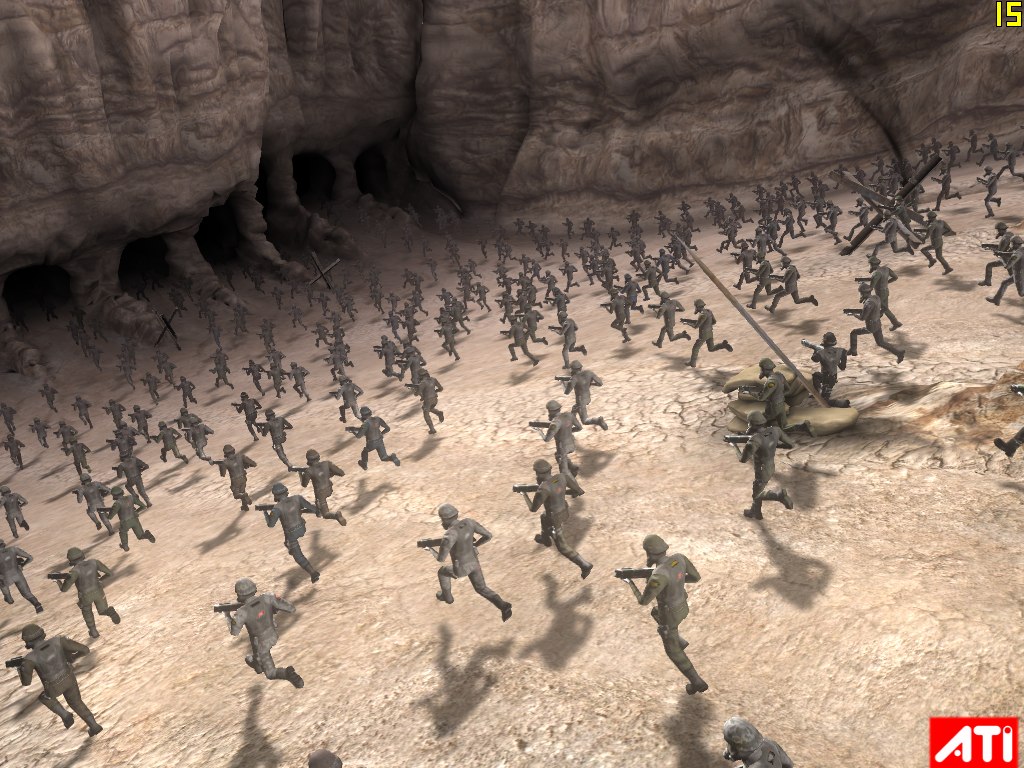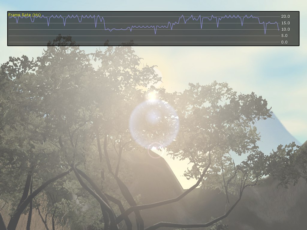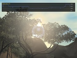 これらは木や草といった自然景観の生成エンジンを作成しているIDVのプログラムで,さまざまなゲームに取り入れられている。最近はUnrealエンジンに組み込んだデモとして配布されている。これは一定のエリア内を自由に動き回れるというデモだが,自動デモモードなどはついていない。ではということで,Unrealのコンソールを開いてdemorecしたデータを作ってやればベンチを作れるかとやってみたのだが,残念ながら再生するとオブジェクトの種類がちょっと変になるみたいだ。同条件ということならベンチマークとしては使えなくもないが,見た目に明らかにおかしいので使い物にならないという結果になった。まあ,しかたないか。 最新のSpeedTreeでは,DirectX 9.0cで拡張されたオブジェクトインスタンシングが実装されているという。もともと負荷が軽くて,GeForce 6800だと残念ながら差が見えるほどのパフォーマンス向上は体感できなかったが,最新機能を試したい人にはお勧め。 私のお気に入りは,The Valley。これはSpeedTree系のデモだが,自動実行なので眺めているだけでいいし,画面も綺麗だ。草の密度を最大にしてCPU,GPUパフォーマンスの参考にしている。たぶんGPU部分はあまり関係ないみたいだけど。ベンチマークなどの単独テストで高いスコアを出しても,実際にゲームをやってみるとなんか遅い……という経験はないだろうか? なんとなく,そのへんのよくわからない部分が見えてくるデモだと思っている。 さて,私の使っているマシンにAthlonXP/1500+とGeForceFX 5200@AGP4XのPC(A)とAthlonXP/2000+とGeForce 6800GT@AGP8XのPC(B)があるのだが,常識的に考えればどう考えても(B)のほうが圧倒的に速いはずだ。多くのテストで,やはりそういう結果が出る。しかし(B)はなんとなく動作が重く,(A)のマシンはゲームをしててもかなり軽いのだ。このThe Valleyを使うと,下のような結果となった。ちなみにメモリはどちらも1GBで,(A)にはPC2700メモリ,かたや(B)にはPC133時代のメモリが使用されている(DDRですらない)。いまもって謎だ。