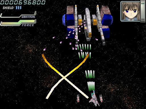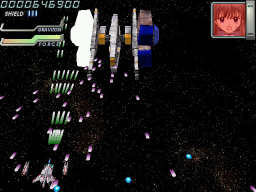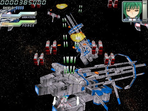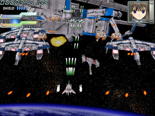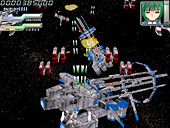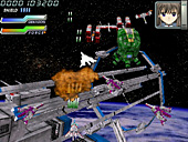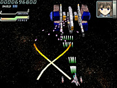宇宙モノSFアニメを感じさせる演出が,「イディナローク」(IDINALOQ)の特徴だ。やや古い作品ではあるものの,しゃべりまくるキャラクターを比較的早期に盛り込んだ点もあって,知名度は高い。 基本スタイルは素直な縦スクロールシューティングだが,画面は上を奥に倒し込んだ3D風で,自機・敵機とも立体的だ。シューティングに詳しい人なら「レイストーム」系といえば話が早いだろう。背景には立体っぽいオブジェが配置されてダイナミックに動いたりもするが,ゲームの領域はあくまでも平面である。 ザコ退治の道中と最後のボス戦がセットになったオーソドックスなステージ構成と,派手な画面で"お約束"のゲーム性が発揮され,意味深なストーリーが展開する。フルボイスで再生される,感情を押し殺したキャラクターのモノローグが,世界観や舞台を説明していく。その雰囲気は,アーケードシューティングというよりも黎明期のCD-ROM版コンシューマゲームのそれを連想させる。 プレイの最初にパイロット(機体)を選択できるが,それぞれの攻撃方法には見た目ほど大きな違いはない。むしろプレイのキモはシールド操作にあるので,性能差を気にするならシールドによるレーザー充填の効率(後述)を重視すべきだろう。 3D風シューティングに共通する問題として,最初は機体の感覚がつかみづらく,避けているつもりでぶつかるような場面も多い。とくに横から出てきたり斜めから体当たりしてくる敵機はクセモノだ。とはいえ,プレイを重ねて慣れればムダなミスは減らせるし,敵の配置のクセも理解できる。 このほか初級者向けのポイントとしては,無理にでも敵を全滅させようと大きく動き回らないこと,ゲージの回復を見なくてもシールドが使えるタイミングを把握できるようにすることだろうか。これらを心がけるだけで,かなり遊びやすさが変わってくる。サブショットを端から使いこなすなどは,あまり考えないほうがいいかもしれない。 弾幕についていうと,実は本作であまり前面に押し出される要素ではない。後半のボスなど,場所によっては熾烈な攻撃も見られるが,弾幕美を鑑賞するという感じではない。実際のところ厄介な攻撃といえば,独特の発射音で放たれる黄色い誘導(?)レーザーだ。いくつかの軌道が決まっており,場所取りを間違えなければかわせるが,発射直後は見えづらいため軌道を判定しにくかったり,弾の隙間で身動きできないときがあったりと,思うに任せないこと多い。 難易度設定やプレイスタイルの選択はないので,あくまでも与えられた難度でプレイすることになる。ボタンの割り当て変更や同時押しボタンの設定ができないのは,やや残念なところだ。とはいえ,全体にそれほど難しさや厳しさをウリにする内容でもなく,ステージ数も多くない。コツコツやれば報われるという意味で,とっつきやすく遊びやすい作品といえようか。 (八重垣那智)