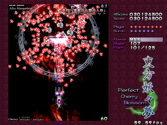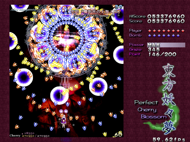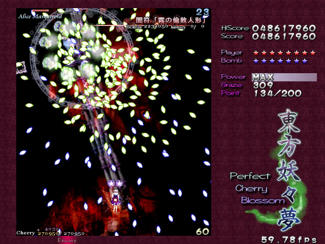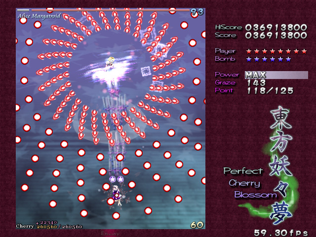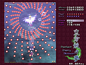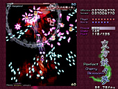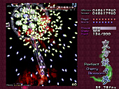美しい弾幕は大量の弾で成り立つが,そもそも弾幕が美しいと認識してもらうためには,プレイヤーにそれを味わえるだけの余裕を与えなければならない。これは大いなる矛盾だ。爽快感を求めるタイプの"正当派"シューティングで美しさを追求するならいざ知らず,弾数は少ないが美しい弾幕などというものはあり得ないからだ。 東方シリーズ――現在入手可能なのは,Windows用として初めて登場した第6弾「東方紅魔郷」以降,「東方妖々夢」「東方永夜抄」なので,話はこれらに絞るが――の価値は,この相容れぬ命題に正面から取り組んだ点にある。美しい弾幕を追求しつつ,さまざまなレベルのプレイヤーに余裕を提供する……。東方シリーズがいわゆる"同人ソフト"であり,メジャーなジャンルとは言いがたい弾幕シューティングでありながら,尋常ならざるプレイヤー数を得た理由は,明らかにここにある。 どうやっても避けられそうにない敵の乱射乱撃。だが,それらのほとんどには少なくとも一つ以上のはっきりとした抜け道が用意されている。はじめはただひたすらバラ撒かれているようにしか見えなかった敵の弾の間に,ふとした隙間や仕組まれた一本道を見出せた瞬間,プレイヤーには余裕が生まれ,それまで雑然と見えていた弾は「弾幕」という集合体として捕捉可能になる。 弾幕シューティングを"楽しむ"とはどういうことか,東方シリーズはすべてのプレイヤーにその答えを提供してくれる。一方その完成度ゆえに商業作品と比べられることが多く,しばしば劣る点があげつらわれてしまうのも事実だ。例えば,コミックマーケット66で販売される最新作「東方永夜抄」の基本システムを話題にするならば,どうしても商業作品たる「斑鳩」と比べてしまうのが人情かもしれない。東方永夜抄では,プレイヤーキャラクターは基本的に人間と妖怪の二人(?)一組。高速移動(人間)と低速移動(妖怪)を適宜切り替えるシステムで,選択によって倒せたり倒せなかったりする特定の敵が存在するため,斑鳩風といってしまうことは確かに可能だ。 しかし,少なくとも体験版をプレイする限り,この切り替えに無理はないのである。ゲームである以上慣れは必要だが,意図的に切り替えなければすぐに難易度が上がるというシステムは,商業作品とはまた違ったとっつきやすさとして評価できる。東方紅魔郷や東方妖々夢はもっとシンプルだが,誰にでも弾幕の芸術性が味わえるようにという配慮は一貫している。いや,グラフィックス面の未完成具合と,いかにも最近の作品らしい"深読み"を誘うシナリオ/設定が,多くの"二次創作"を生んでいるのはまた別の論点なのだけれども。 「こちら」の上海アリス幻樂団のサイトで配布されている東方妖々夢,さらにいえば東方シリーズの体験版はそういった意味で,初めて弾幕シューティングに挑戦する人には最適の教材といえるだろう。なおこのゲームは,ぜひとも可能な限りの大音量で楽しんでいただきたい。 (佐々山薫郁)