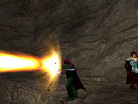 ちなみに敵に密着された状態でQuickCastスキル→スタン→攻撃呪文というのは有効ではない。というのは,本作では戦闘モードに入っている敵に密着していると,呪文の詠唱を邪魔されることがある。実はスタンをかけると,敵の攻撃は停止するが呪文の妨害判定は残っているのだ。だからスタンのあとにどうしても攻撃呪文を使いたい場合は,Sprintスキルなどで十分に距離をとってから使うようにしよう。 |
