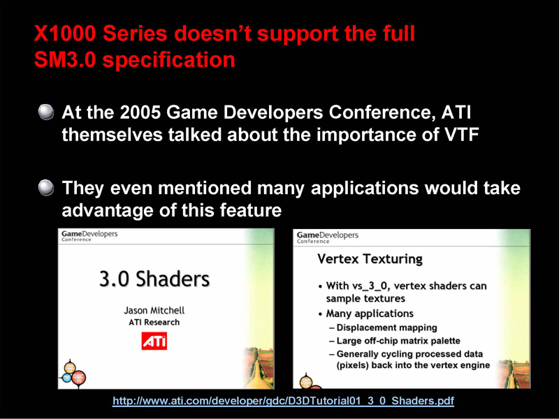| 簡単に言えば「VTFの重要性はATIも訴えていたのに,Radeon X1000シリーズでは対応していないんですよ」というNVIDIAのスライド。下に挙げられている2枚は,Game Developers Conference 2005でATIが実際に用いた資料の引用だ |
