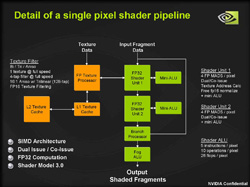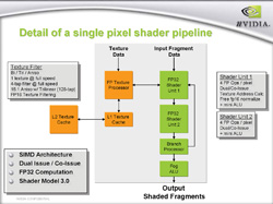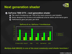 NVIDIAは「GeForce 7800 GTXは,1ピクセルシェーダユニットあたりのFP32ベクトル積和演算性能が6800 Ultraの2倍になった」と,7800 GTXの先進性を強調しているが,この2倍というのは,そういう意味だったわけだ。