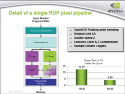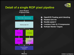 冒頭に挙げた全体ブロック図を見返してもらうと分かるが,7800 GTXと6800 UltraのROPユニット数に変わりはない。16基のままだ。なんとなく,6800 Ultraと比べて7800 GTXのブロック図は尻すぼみになっているように見える。「ROPブロックがボトルネックになって,フルにパフォーマンスが発揮できないのではないか?」と心配になる人もいるのではなかろうか。