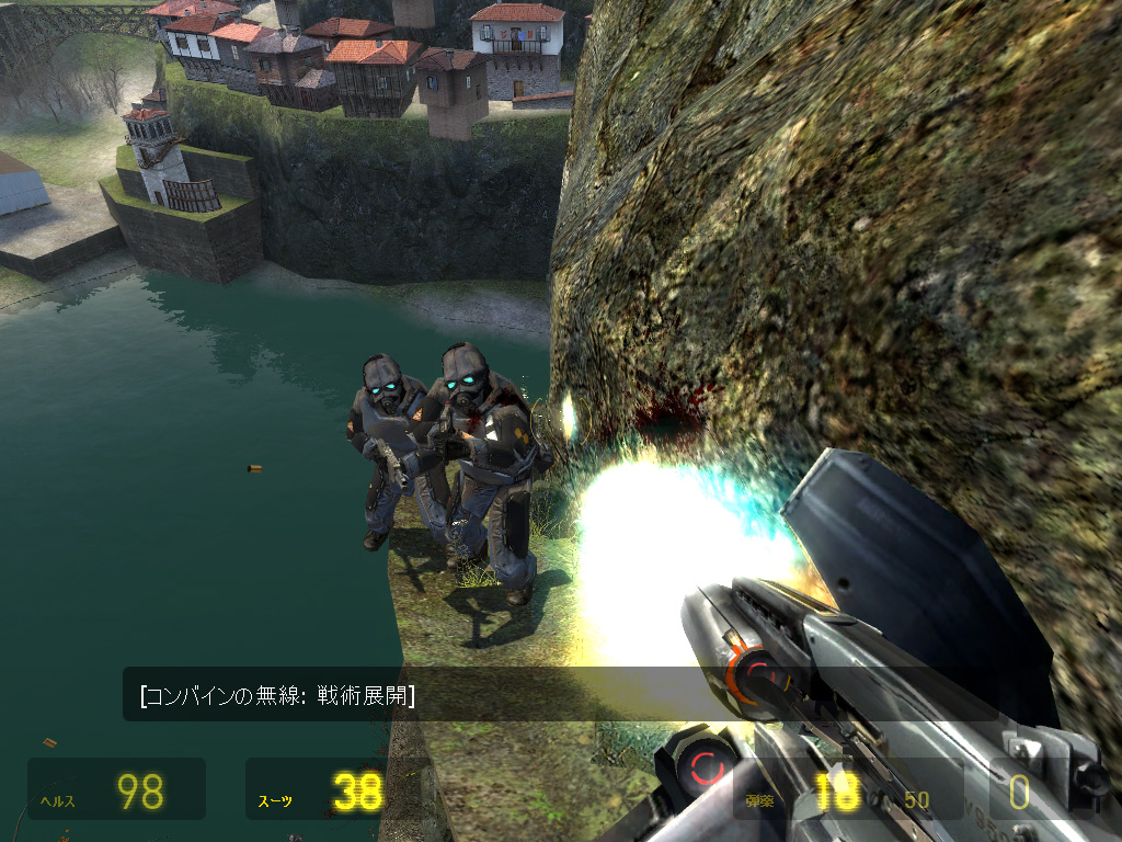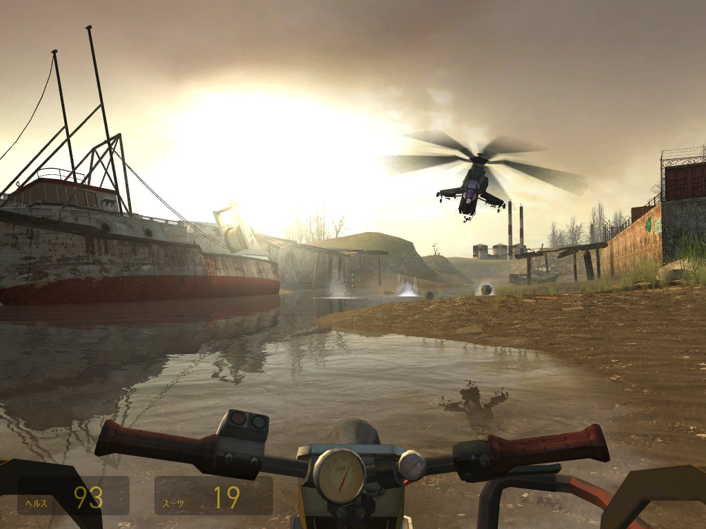 ステージはこの崖のシーンのみで,このボスを撃破しても,次のミッションに進んだりはしない。これが全部である。サクサク進めば30分程度でクリアできるから,ゲームファンの立場からすれば,HL2LCはHL2の無料追加ミニミッションといったところだろうか。