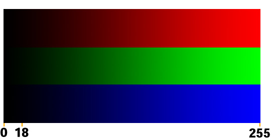 各色256段階で,18付近の色を見てみるとこんな感じ。ディスプレイの輝度設定にもよるが,かなり黒っぽい色なのが分かる