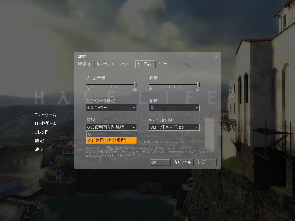 HL2LCのプレイに当たって,ぜひ味わってほしいのが解説モードだ。「設定」メニューにある「オーディオ」タブの「解説」を「ON(使用可能な場所)」にすることで解説モードは有効になり,HL2LCの各シーンで吹き出しマークが出るようになる。