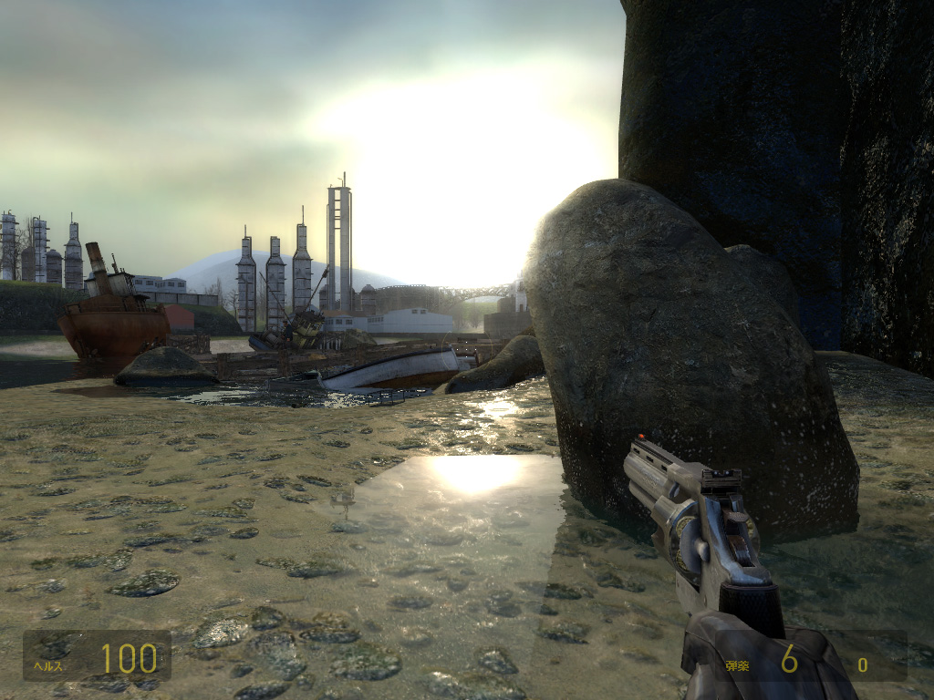 HL2からの1シーン。スカイボックスの太陽はブルームを起こしているのに,水面に映り込んでいる空はブルームを起こしていない