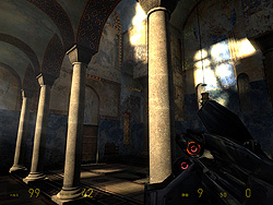 HL2LCにおいては,崖の上の教会に入ることでこの効果を実感できる。下の画面6点は,いずれも左がHL2オリジナル,右がHL2LCでHDRレンダリングモードを有効にした結果だが,違いは一目で分かってもらえると思う。薄暗い中にも明暗ははっきりと表れ,陰影が非常に見やすくなっている。