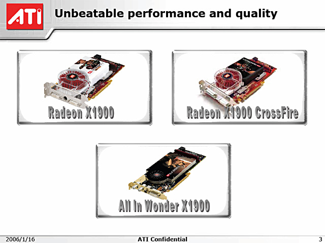 今回発表されたRadeon X1900シリーズは,表1で示したように,通常モデルとなる「Radeon X1900 XT」と,最上位のプレミアムモデルとなる「Radeon X1900 XTX」が用意される。また,肝心要のテレビチューナ周りのスペックが日本市場向けでないため,国内の正式発売予定がない「All-in-Wonder Radeon X1900」も,コア500MHz,メモリ1GHz相当という動作クロックで,北米市場向けに発表された。3モデルの違いは動作クロックのみで,機能的にはまったく同一だ。