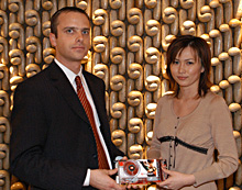 Radeon X1900 XTカードを持つTaranovsky氏と,ATIテクノロジーズジャパンの広報,金井華奈子さん