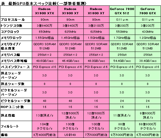主なスペックは表1にまとめたが,製造プロセスは90nmで,総トランジスタ数は3億8400万。Radeon X1800と比べると,製造プロセスは同じで,総トランジスタ数は6300万増ということになる。