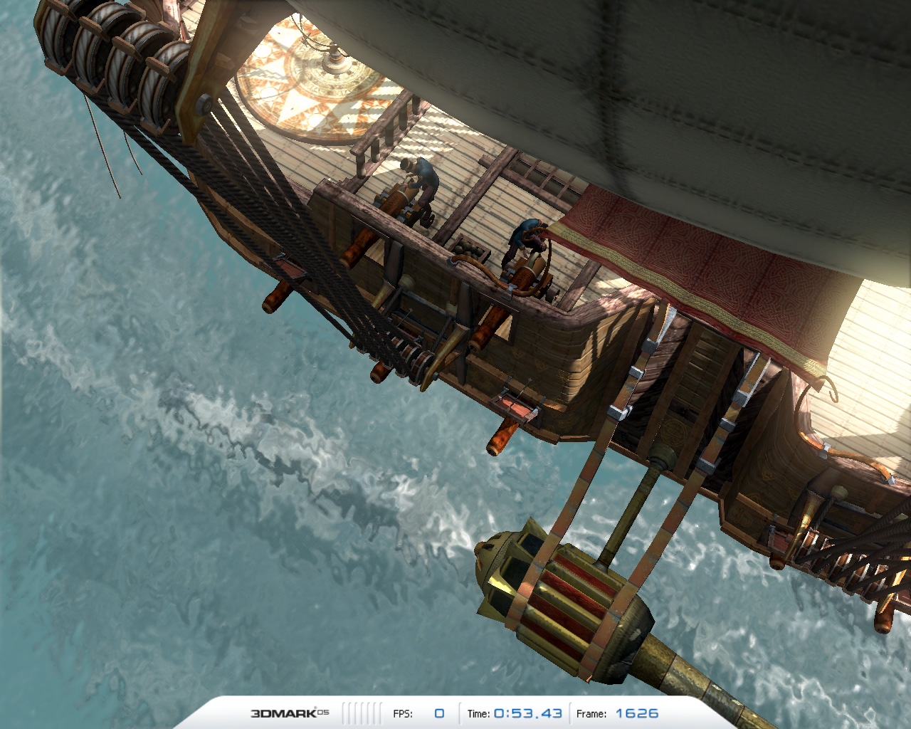 3DMark06ではこれに加え,頂点単位の波動シミュレーションを行い,ジオメトリレベルで(=3D形状として)水面に凹凸が作られる,大局的な波の効果も加えている。波動シミュレーションには「水深の深い大洋の波に適している」といわれる「ゲルストナー波動関数」(Gerstner Wave)を用いて内部的に四つの波を生成している。ほぼ平行に並んで動いている太めの指向性のある波がその効果だ。なお,このテストはVTFを利用していないので,波動シミュレーションは自体はCPUで行っていると推察される。