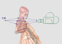 表面下散乱とは,光がその材質の中を伝って出てくる現象をいい,身近なところでは光にかざした手のひらが鈍く光ったりするあれだ。半透明材質であることを表現するのに適しているほか,人肌の表現にも有用であるとして3Dグラフィックスの研究テーマとしては最近盛んになっている。