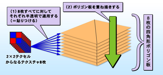 こちらは,2×2テクセルのテクスチャを8枚を重ねて,それを画面大の四角形ポリゴン板に適用。これを1セットとして,8セットを重ねるようになっている(図2)。