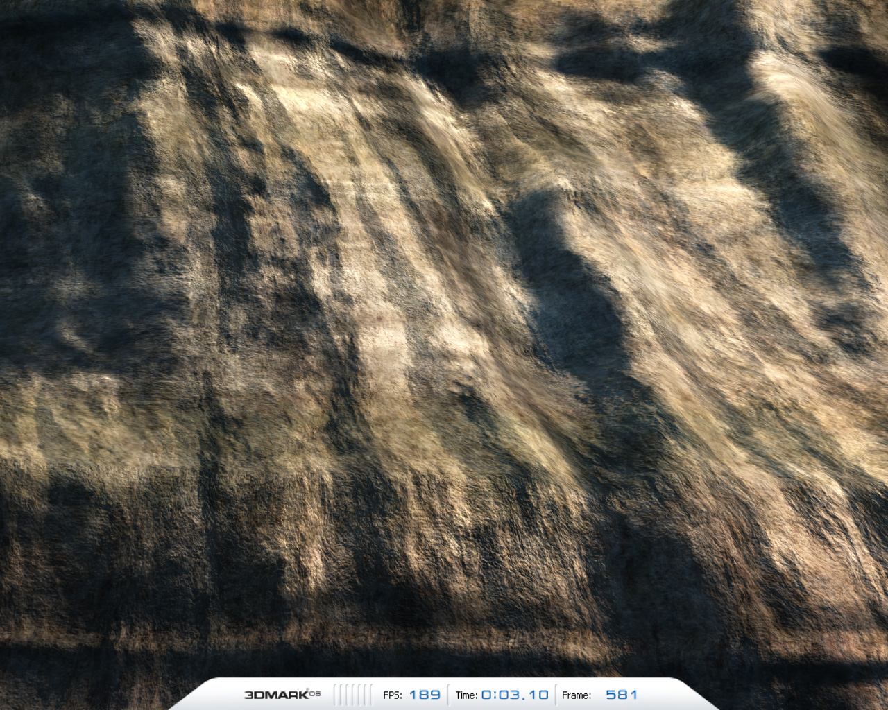 テストに用いられるのはSM3.0 Graphics Test 1の水棲怪物と飛行船のシーンで用いられた「岩壁」のシェーダ。頂点レベルでの光源処理をしたこの岩壁を画面全域に表示するもので,水面などは登場しない。なお,シェーダ設計そのものはプログラマブルシェーダ2.0(Shader Model 2.0,以下SM2.0)レベルのものになっており,SM2.0対応グラフィックスチップでも実行できるようになっている。もっといえば,このテスト自体は3DMark05のPixel Shaderテストと基本的にまったく同じである。