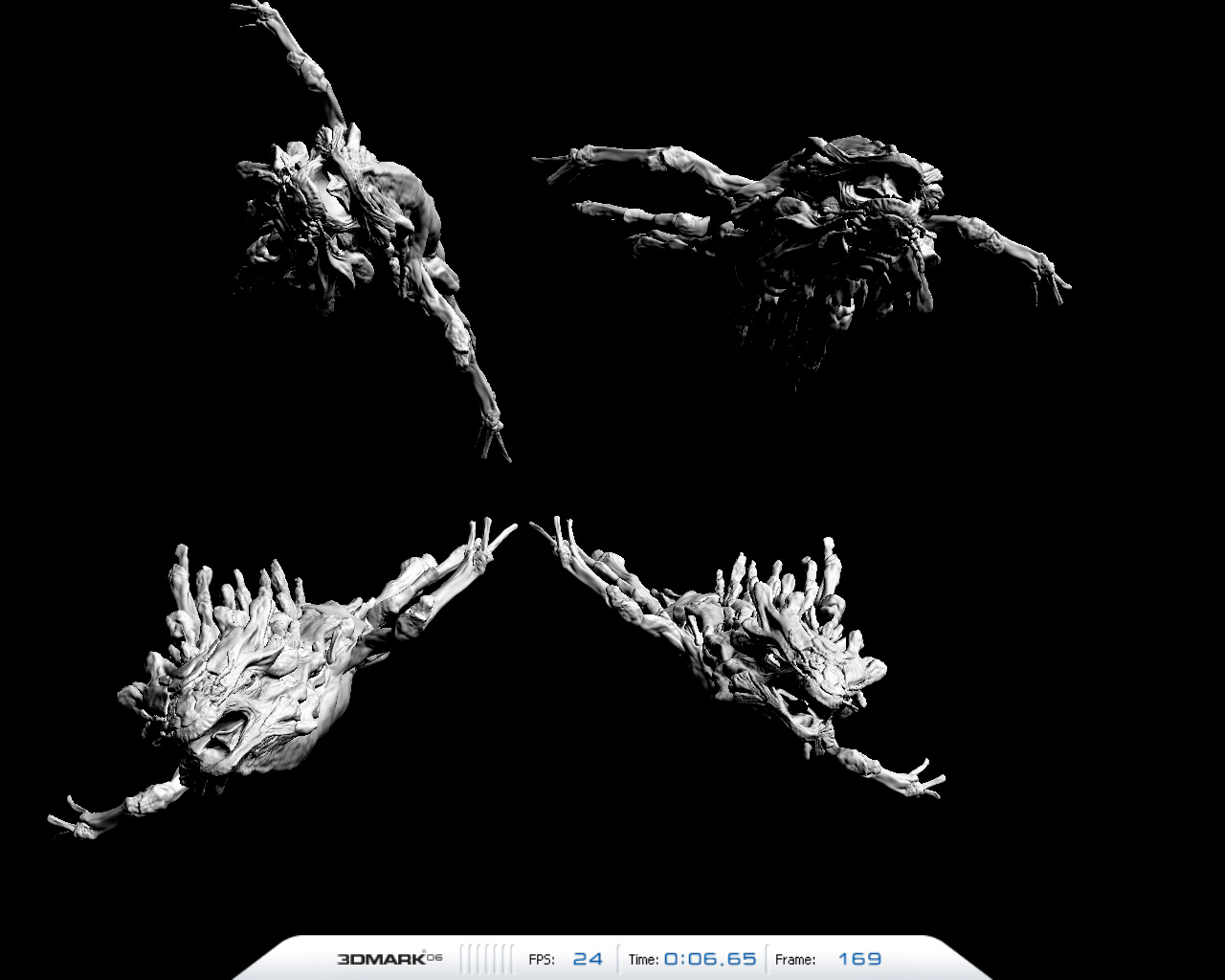 超多ポリゴンといえる約100万頂点からなる水棲怪物のモデルを4体(合計400万頂点)をテクスチャなしで表示し,回転させながら頂点単位のライティングを施すテストだ。