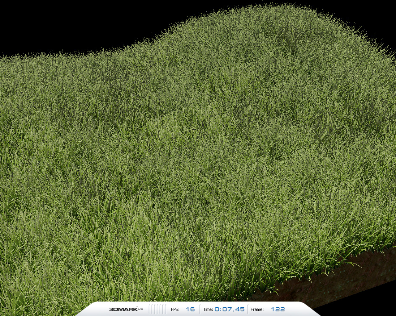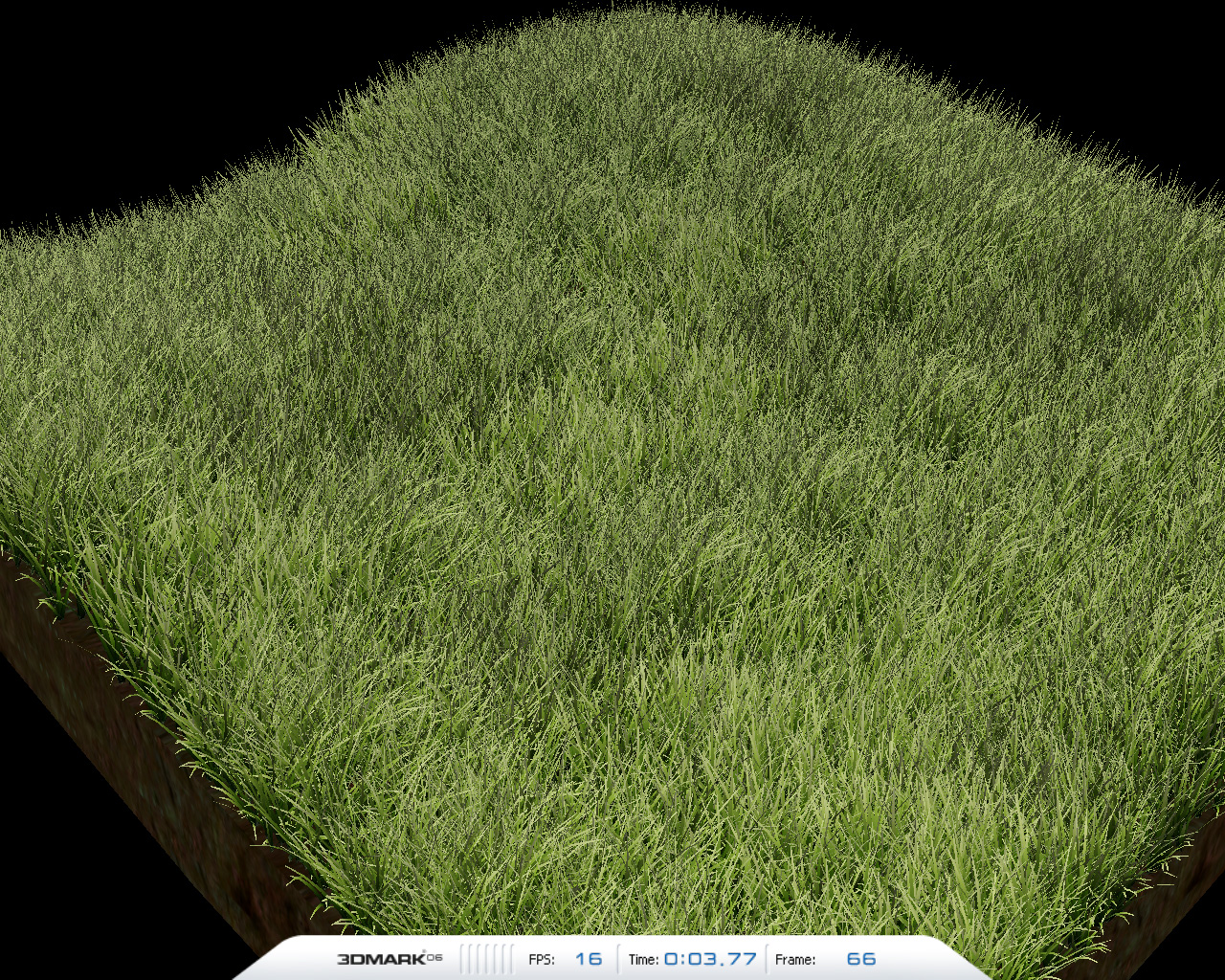 テストでは,草の生えたフィールドの全域がなるべく常時描かれるよう,やや視点が引いた構図になっているが,これはフィールド上の草すべてに対して実際に頂点シェーダプログラムの処理が実行されるようにするため。言い換えると,視点を近づけすぎて,草が画面外にクリップアウトしてしまうと,画面外にある草に対しては頂点シェーダプログラムの処理が省略されてしまうからだ。また,画面上のピクセル描画量をあまり変化させずに,頂点シェーダユニットの性能測定を行う狙いもある。