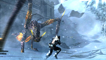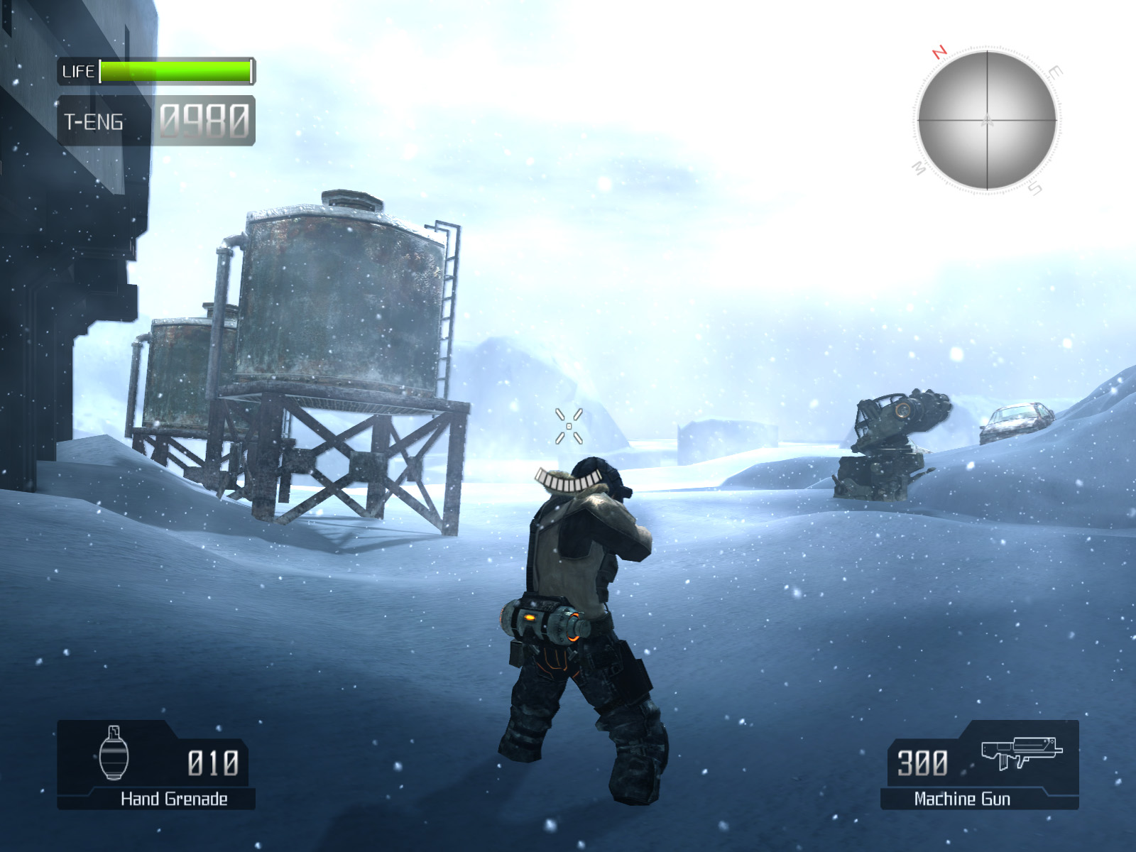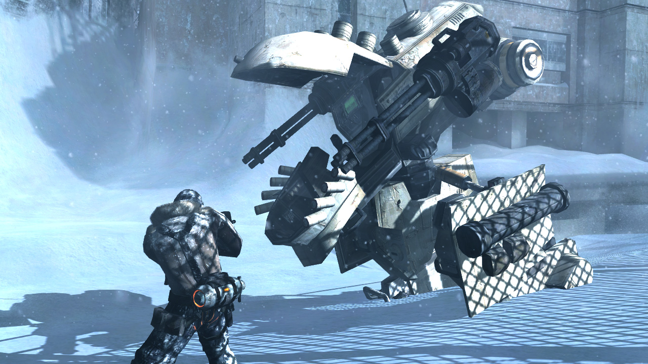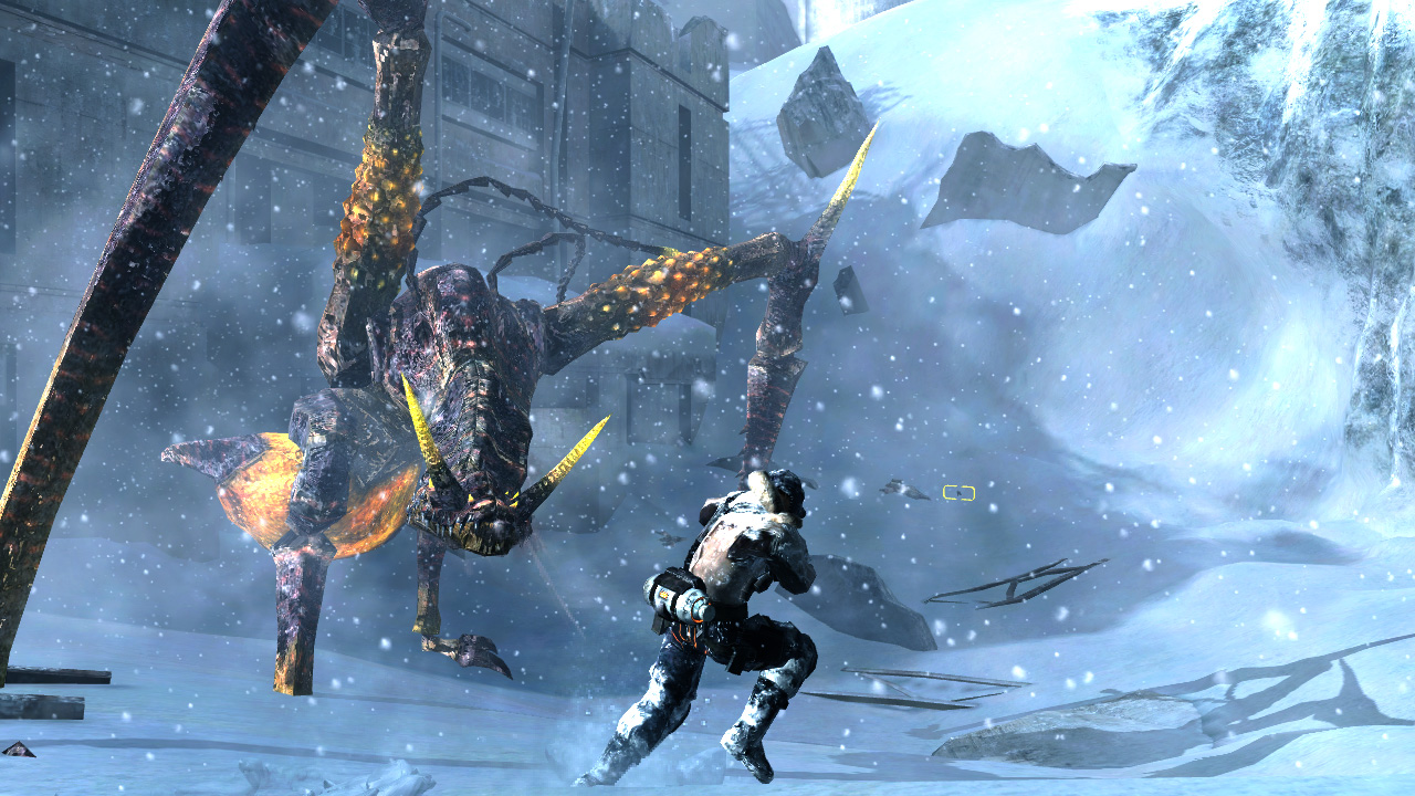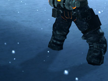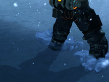 ロスト プラネットでは,1キャラクターあたり1万〜2万ポリゴン,「VS」(バイタルスーツ)と呼ばれる機動兵器で3万〜4万ポリゴンくらい使われている。背景は50万ポリゴンで,影生成などに用いられる中間レンダリングコストまでを含めると,1フレームのレンダリングを完了するのに300万ポリゴンくらいのレンダリングが行われる計算だ。PlayStation 2世代のタイトルだと,シーン全体でも数十万ポリゴン程度で,あの3DMarkシリーズでも100〜200万ポリゴンと書くと,ロスト プラネットのポリゴン数がいかに多いかイメージできるのではなかろうか。