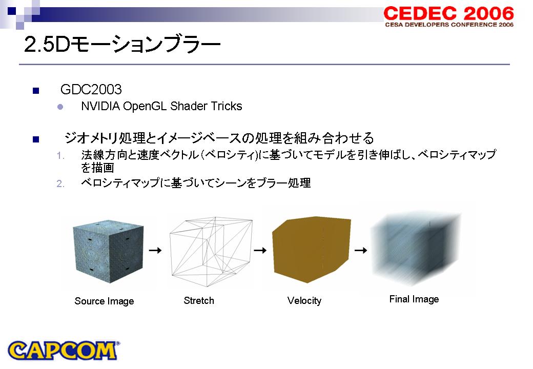 モーションブラーとは,速い動きに対し,その動く方向に合ったボカシを入れる処理のこと。これまでの3Dゲームでもモーションブラー処理がなかったわけではないが,画面全体にブラーをかける,いわゆる「カメラブラー」が主流だった。