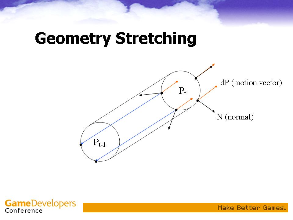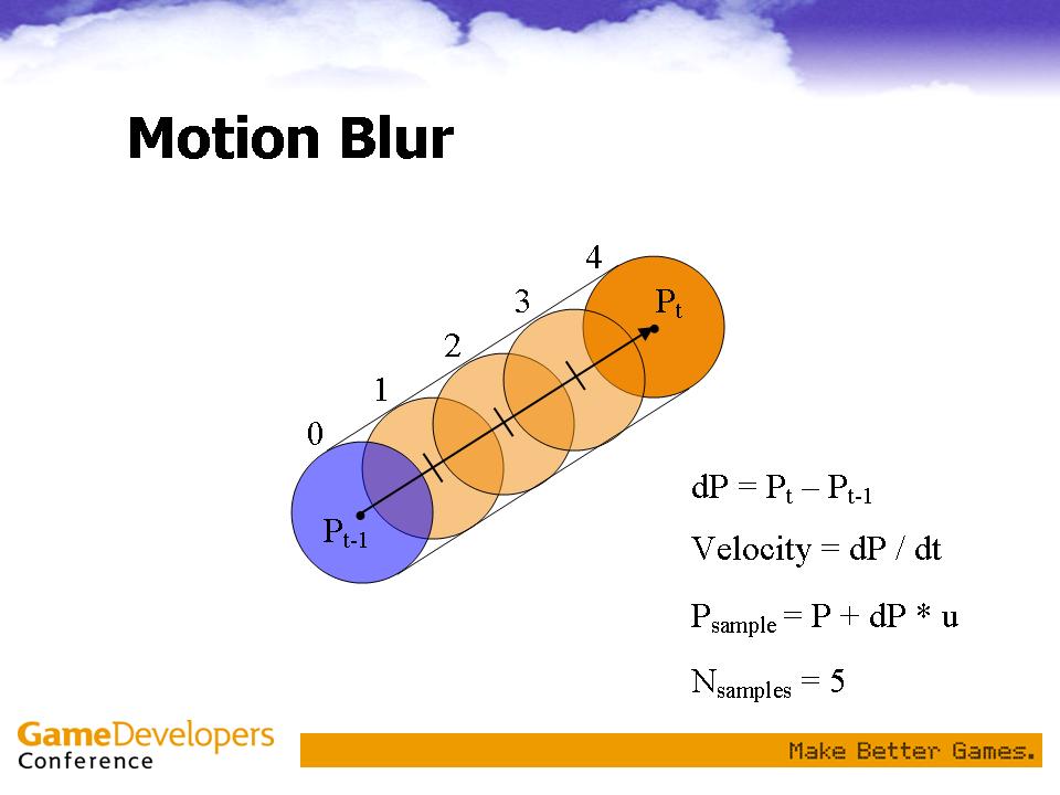 「前回位置から現在位置まで大きく離れている」という情報が判明したとしよう。その場合は「速い動き」であると分かるので,サンプルしたピクセルの色を薄めるといった処理が行われる。こうすると,「速度の速いところは薄く,遅いところほど濃くなる」という,立体的な残像を作り出せる。