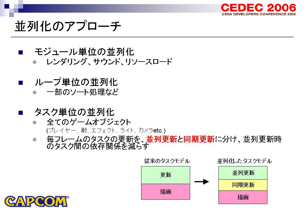 ただ,こう聞くとシンプルに思えるかもしれないが,実際に同時多発するジョブそれぞれには依存関係があったりするので,それほど簡単ではない。そこでカプコンでは,ゲームプログラム構造を分析し,マルチスレッド実行が可能なものと,そうでないものに大別。マルチスレッド実行に向いてない処理についてはシングルスレッドで集中的に実行させ,向いているものについては依存関係が破綻しないようにスレッドの実行を操作&制御する仕組みを設計し,これをMT Frameworkに実装させている。