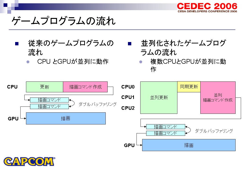 そんな要求に対し,ゲームデベロッパとしてのカプコンが回答として用意したのが,初めからマルチスレッド最適化を前提としたゲームエンジン(で,前編の冒頭にその名を挙げた)「MT Framework」である。