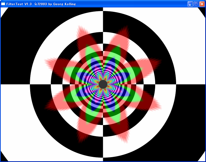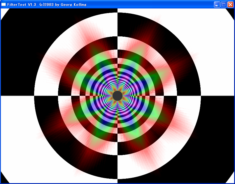 ご覧のように,花型のような形状になってしまっている。これは角度や距離に応じてMIPMAPの参照法が違っていることの証になる。条件が揃うと,テクセルサンプル数を減らしたり,あるいはバイリニア型異方性フィルタリングに切り換えたりしていると思われるが,具体的な処理内容まではこの図からは読み取れない。