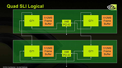 ただ,よくよく見てみると,ブロックダイアグラム内,対角線上で向かい合うGeForce 7900を連携するためのラインがないことに気づく。具体的には,左上と右下,右上と左下の組み合わせにおいて,である。