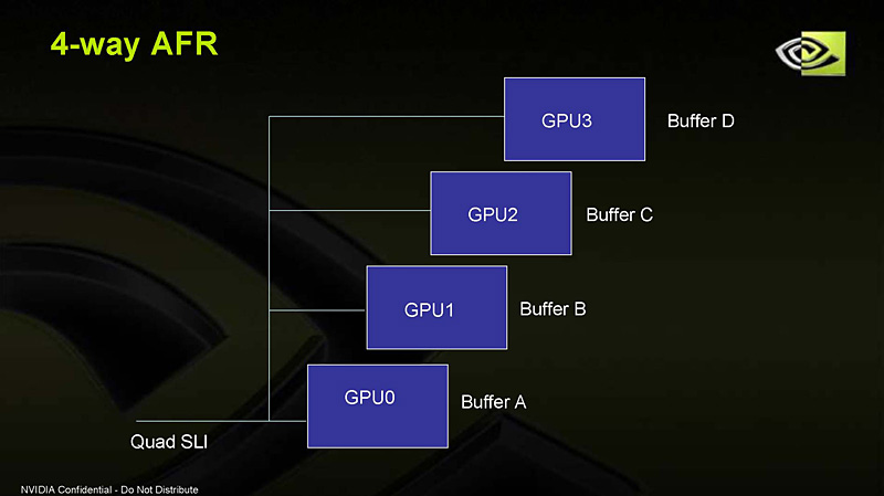 概念図では,4個のグラフィックスチップを「GPU0〜3」と表記しているが,「GPU0でフレーム0,GPU1で続くフレーム1,GPU2でフレーム2,GPU3でフレーム3」という感じで,4個のグラフィックスチップがそれぞれ連続する次フレームをレンダリング。各フレームの描画をオーバーラップできた分だけ高速化につながる,というのがこのモードの特徴だ。